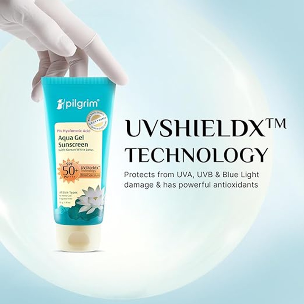 Pilgrim 1% Hyaluronic Acid Sunscreen Gel | Sunscreen SPF 50+ PA++++ for Men and Women with Korean White Lotus | Light Aqua Gel Formula | Broad Spectrum, No White Cast & Prevents Tanning | All Skin Types | 50 gm